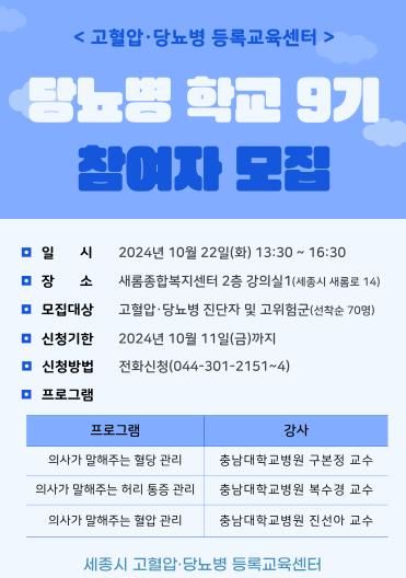 [경남도민뉴스=도문호 기자] 세종특별자치시 고혈압·당뇨병 등록교육센터가 고혈압·당뇨병 환자의 치료율과 고위험군의 자기관리 능력을 높이기 위해 ‘행복한 당뇨병 학교 9기’ 강의를 연다.