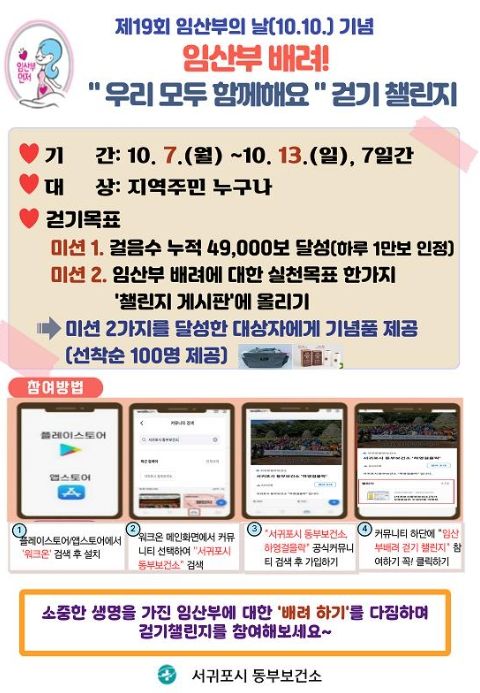 [경남도민뉴스=경남도민뉴스 기자] 서귀포시 동부보건소는 오는 10월 10일 제19회 임산부의 날을 맞이하여, 임산부 배려 문화조성을 위해‘임산부 배려 걷기 챌린지’를 실시한다고 밝혔다.
