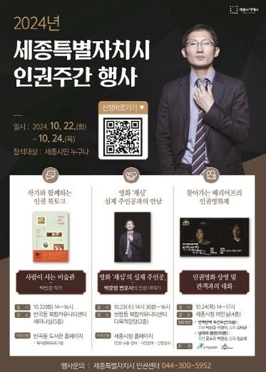 [경남도민뉴스=도문호 기자] 세종특별자치시가 오는 22일부터 24일까지 시청과 반곡동·보람동 복합커뮤니티센터에서 2024년 세종시 인권주간 행사를 연다.