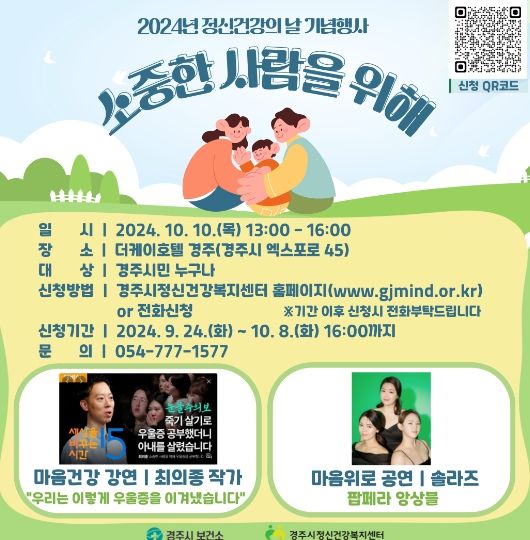 경주시정신건강복지센터 관계자는 “시민들의 정신 건강에 대한 인식을 높이고 편견을 해소하는 시간이 되길 바라며, 행사에 많은 관심과 참여 부탁드린다”고 전했다