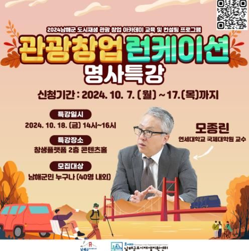 [경남도민뉴스=김부경 기자] 남해군 도시재생지원센터는 오는 18일 오후 2시, 창생플랫폼(남해읍 화전로78번가길 25-10)에서 관광창업 런케이션 5기 명사특강을 개최한다고 밝혔다.