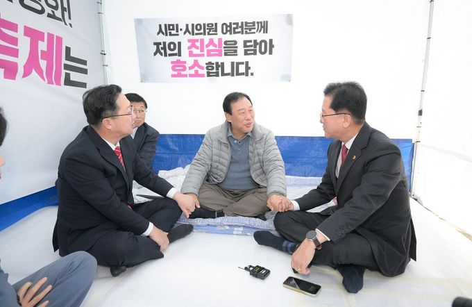 한편, 이날 오전 이장우 시장의 단식 호소 현장 방문에 이어 조원휘 대전시의회 의장과 최원철 공주시장이 연달아 현장을 찾아 최민호 시장을 지지했다.