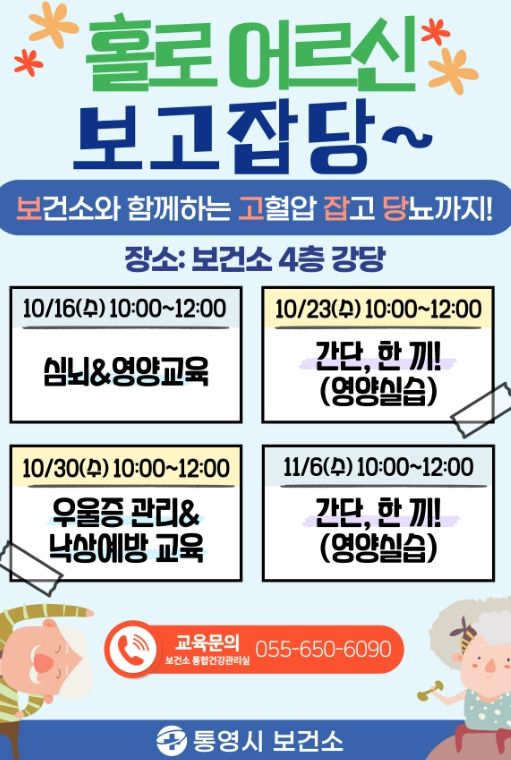 [경남도민뉴스=김부경 기자] 통영시는 오는 16일부터 11월 6일까지 총4회에 걸쳐 홀로어르신을 대상으로 만성질환 건강관리 프로그램을 운영한다.