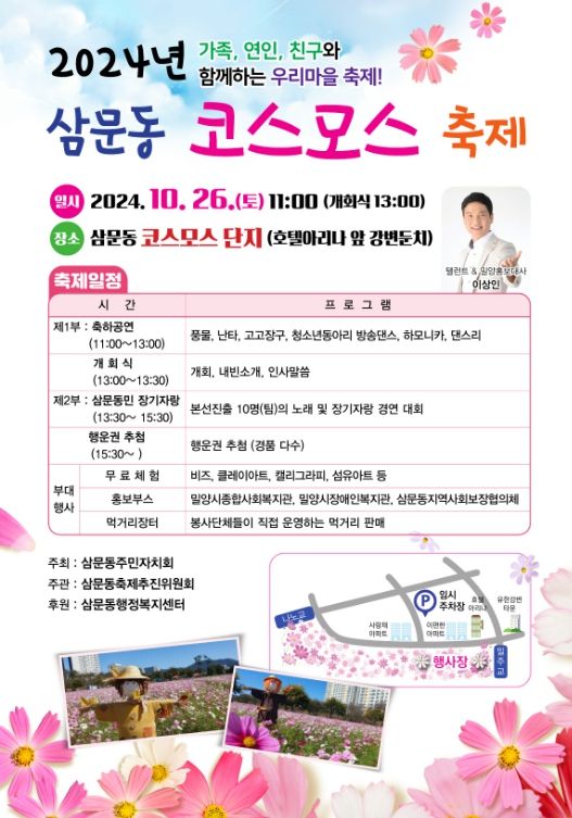 [경남도민뉴스=나희준 기자] 밀양시 삼문동 주민자치회(회장 신용규)는 오는 26일 삼문동 코스모스 단지(호텔아리나 앞 강변둔치)에서 2024년 삼문동 화합 한마당 코스모스 축제를 개최한다고 밝혔다.