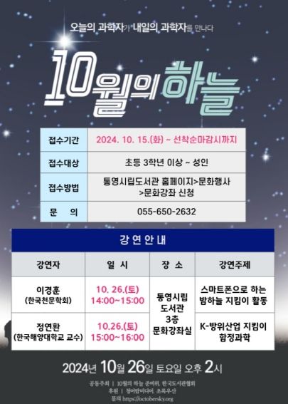 [경남도민뉴스=김부경 기자] 통영시 통영시립도서관은 한국도서관협회와 10월의 하늘 준비위원회가 공동 주최하는 '과학자들의 재능기부 도서관 과학강연 - 10월의 하늘' 공모사업에 선정돼 오는 26일 오후 2시 강연을 개최한다.