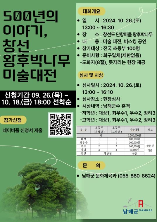 [경남도민뉴스=김부경 기자] 남해군이 오는 10월 26일 ‘500년의 이야기, 창선왕후박나무 미술 대전’을 개최할 예정인 가운데 참가자를 모집하고 있다.