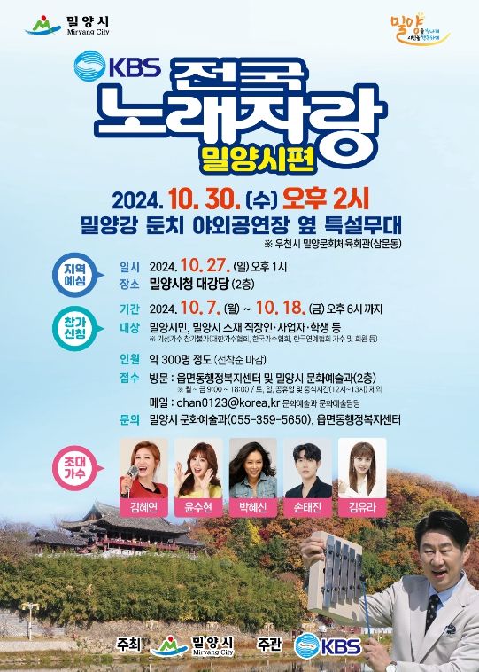 [경남도민뉴스=나희준 기자] 오랫동안 전 국민의 사랑을 받아온 국민 프로그램‘KBS 전국노래자랑’이 2017년에 이어 7년 만에 밀양을 찾는다.