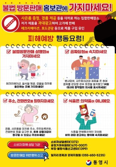 [경남도민뉴스=김부경 기자] 통영시는 최근 신종 방문판매업(홍보관, 떴다방)의 불법행위로 인한 피해를 우려해 시민들을 대상으로 피해 사례 및 예방법 홍보에 나섰다고 15일 밝혔다.