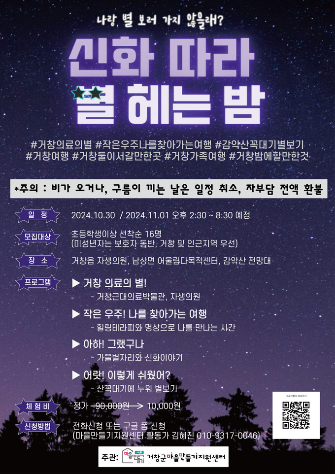네 가지 여행 프로그램은 각각 웅양면 일대에서 진행하는 △버스타고 놀이한바탕, 거창 근대의료박물관과 감악산에서 진행하는 △신화따라 별헤는밤, 수승대 출렁다리와 북상 갈계숲에서 진행하는 △인생은 아름다워 거창 창포원과 남하면 월곡마을에서 진행하는 △친구야 모여라 교복입고 가을소풍으로 구성되어 있다.