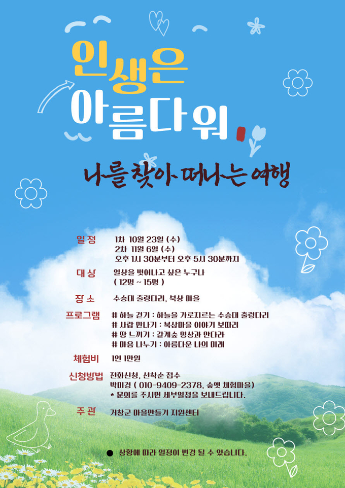 모집은 선착순으로 진행되며, 신청 및 기타 자세한 사항은 각 여행 포스터에 소개되어 있는 마을문화해설 기획자 연락처 또는 거창군 마을만들기 지원센터(055-943-0152)로 문의하면 된다.