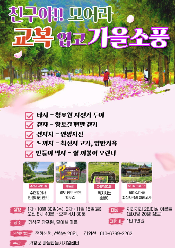 ‘마을로 떠나는 네 가지 가을 여행’은 거창군에서 마을만들기지원센터(센터장 김훈규)에 위탁하여 추진하는 사업으로, 지난 7월 마을문화해설기획자 과정을 수료한 교육생들이 직접 여행을 기획하고 안내한다.
