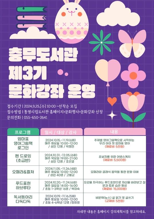 또한 오페라와 클래식 음악을 통해 문화를 이해하는 ▲오페라·컬쳐 강좌는 오는 11월 5일 10시 개강을 앞두고 수강생 모집 중이니 관심있는 통영시민(성인)이라면 누구나 참여 가능하며, 강좌 신청 및 기타 자세한 사항은 통영시립도서관 누리집을 확인하거나 전화로 문의하면 된다.