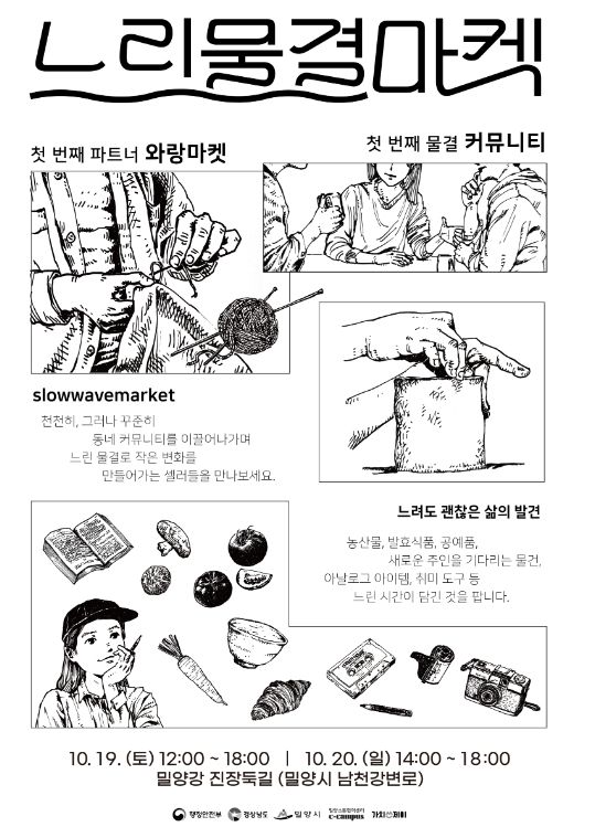 [경남도민뉴스=나희준 기자] 밀양시는 오는 19일 오후 12시부터 오후 6시까지, 20일 오후 2시부터 오후 6시까지 밀양강 진장길 일원에서‘느린물결마켓’이 열린다고 밝혔다.