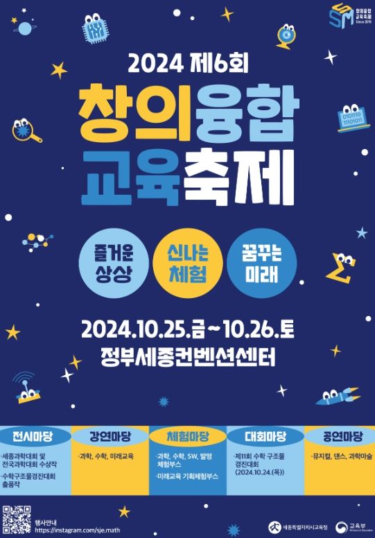 2019년에 처음 시작해 올해로 여섯 돌을 맞는 창의융합교육축제는 10월 25일 10시 20분에 2층 기획전시장에서 진행되는 세종예고 학생들의 개막식 공연을 시작으로 10월 26일 15시에 막을 내린다.