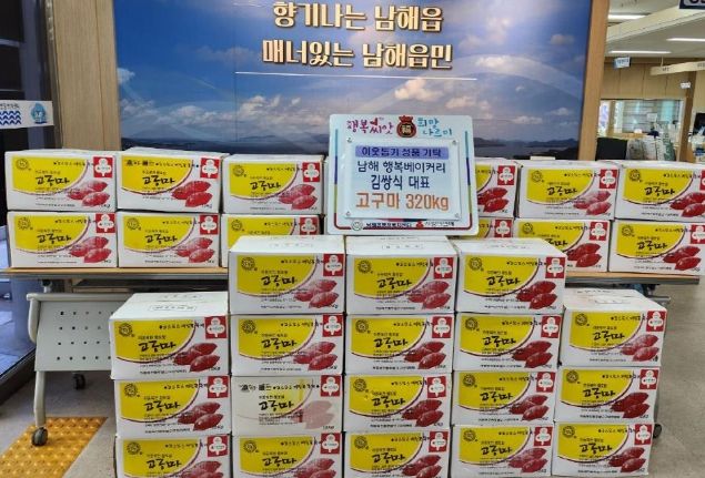 [경남도민뉴스=김부경 기자] 남해읍 행정복지센터는 10월 17일 ‘행복 베이커리’를 운영하는 김쌍식 대표가 관내 각 마을 어르신들에게 전달해 달라며 고구마(10KG) 32박스를 기탁했다고 밝혔다.