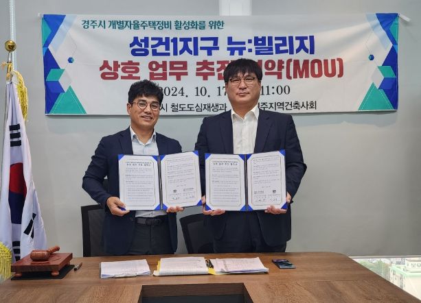 경주시와 주택정비전문기관인 경주지역건축사회는 지난 17일 개별자율주택정비 활성화를 위한 성건1지구 뉴:빌리지 업무협약을 체결했다.