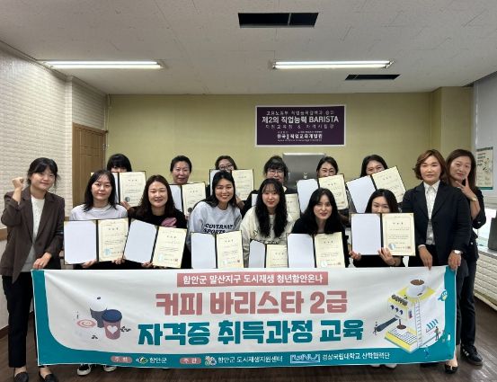 [경남도민뉴스=이상민 기자] 함안군 도시재생지원센터는 지난 17일 지(G)바리스타에서 수강생과 관계자 등 20여 명이 참석한 가운데 커피 바리스타 2급 자격증 취득과정 수료식을 진행했다.