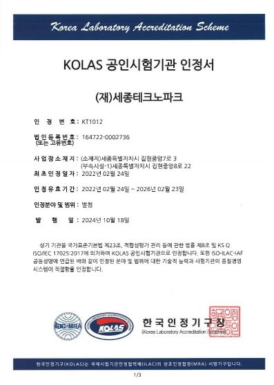 [경남도민뉴스=도문호 기자] 세종시 미래가치를 선도하는 지역혁신성장 거점기관 (재)세종테크노파크는 10월 18일 한국인정기구로부터 KOLAS 공인인증시험기관의 인정범위 확대 승인을 받았다고 밝혔다.