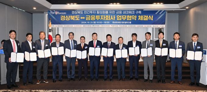경상북도는 21일 서울 여의도 켄싱턴호텔에서 13개 금융투자회사와 ‘경상북도 민간투자 활성화를 위한 금융투자 네트워크 구축’업무협약을 체결했다.