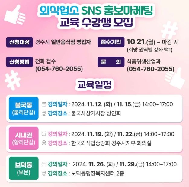 [경남도민뉴스=이돈휘 기자] 경주시가 일반음식점 영업자를 대상으로 외식업소 SNS 홍보마케팅 교육 수강생을 모집한다.