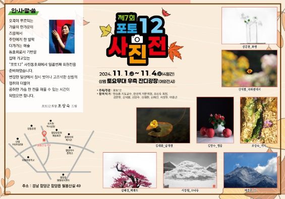 [경남도민뉴스=장광동 기자] 함양군에서 활동 중인 사진작가 모임인 ‘포토12’에서는 오는 11월 1일부터 4일까지 4일간 상림공원 토요무대 우측 잔디광장 특설 전시장에서 사진전을 연다.
