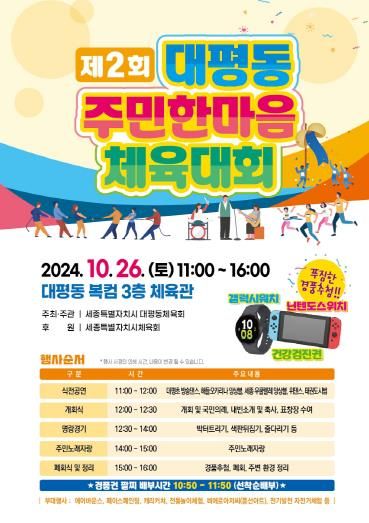 [경남도민뉴스=도문호 기자] 세종특별자치시 대평동체육회가 오는 26일 대평동 행복누림터(복합커뮤니티센터) 체육관에서 ‘제2회 대평동 주민한마음체육대회’를 개최한다.