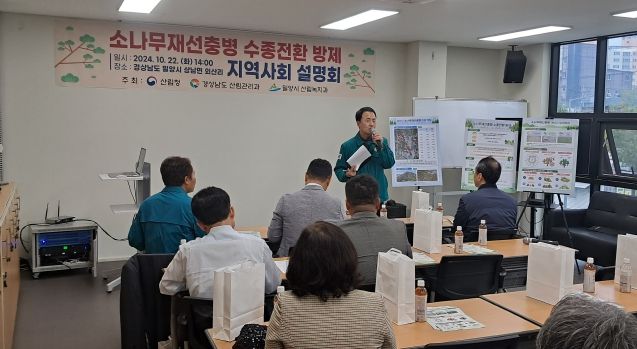 [경남도민뉴스=나희준 기자] 밀양시는 지난 22일 밀양시 산불대응센터에서 산림청, 경남도와 함께 소나무재선충병 특별방제구역 주민을 대상으로‘소나무재선충병 수종 전환 방제 지역사회 설명회’를 개최했다.