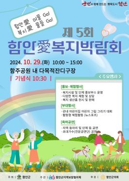 [경남도민뉴스=이상민 기자] 함안군은 제5회 함안애(愛)복지박람회를 오는 29일 함주공원 다목적잔디구장에서 개최한다고 밝혔다. 당초 이달 22일 개최예정이었으나 우천으로 29일로 변경됐다.