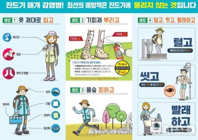 또한 작업 전 진드기 기피제 뿌리기, 풀밭에 앉을 때 돗자리 사용, 작업 후 작업복 분리 세탁 및 바로 샤워하기 등을 실천해야 한다.