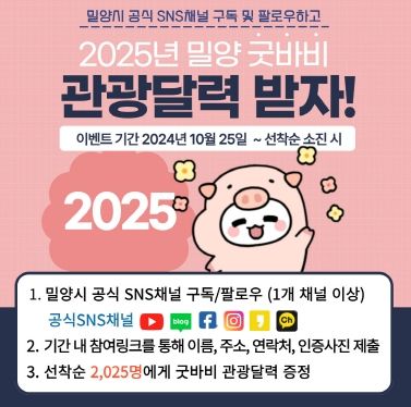 시는 굿바비 관광 달력 배부 이벤트도 함께 진행해 선착순 2025명에게 배부한다. 참여 방법은 밀양시 공식 SNS 채널(유튜브, 블로그, 페이스북, 인스타그램, 카카오스토리, 카카오톡 채널)을 구독하거나 팔로우한 뒤 참여 링크를 통해 이름, 연락처, 주소, 인증사진을 제출하면 된다.