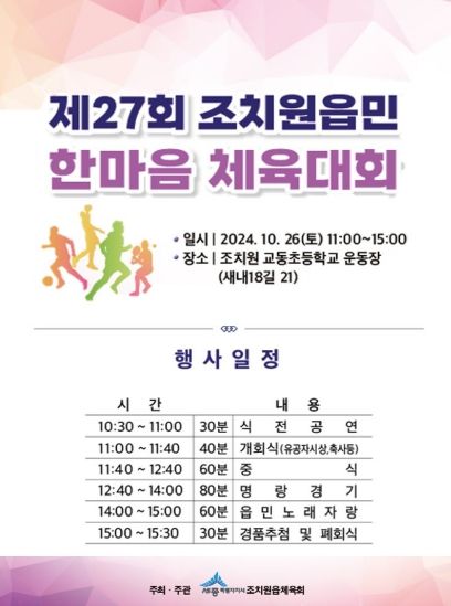 [경남도민뉴스=도문호 기자] 세종특별자치시 조치원읍이 오는 26일 교동초등학교 운동장에서 제27회 조치원읍 한마음 체육대회를 개최한다.