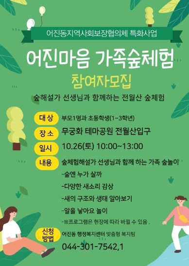 [경남도민뉴스=도문호 기자] 세종특별자치시 어진동 지역사회보장협의체가 오는 26일 ‘어진마음 가족숲체험’ 행사를 개최한다.