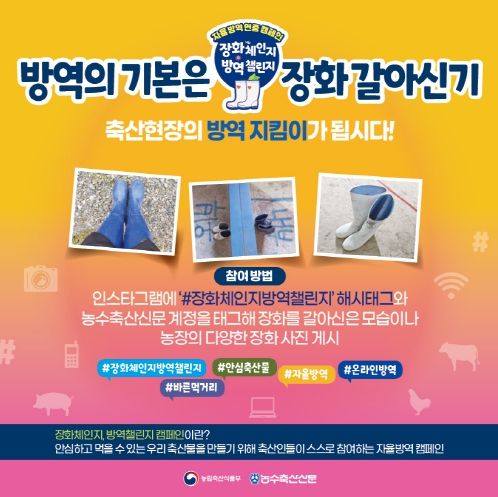 또한, 농림축산식품부에서도 장화 갈아 신기 등 축산농가 기본 방역 수칙의 중요성 때문에 ‘장화 갈이 신기’ 관련 홍보 행사를 추진하고 있다.