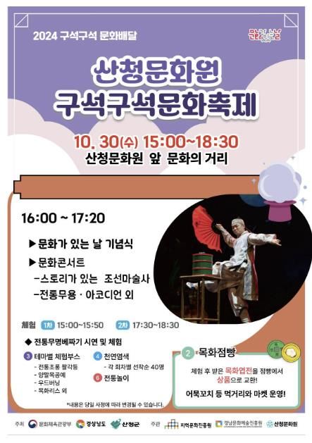 [경남도민뉴스=변정형 기자] 산청군은 오는 30일 산청읍 문화거리에서 ‘2024 문화가 있는 날-산청 구석구석 문화축제’가 열린다고 28일 밝혔다.