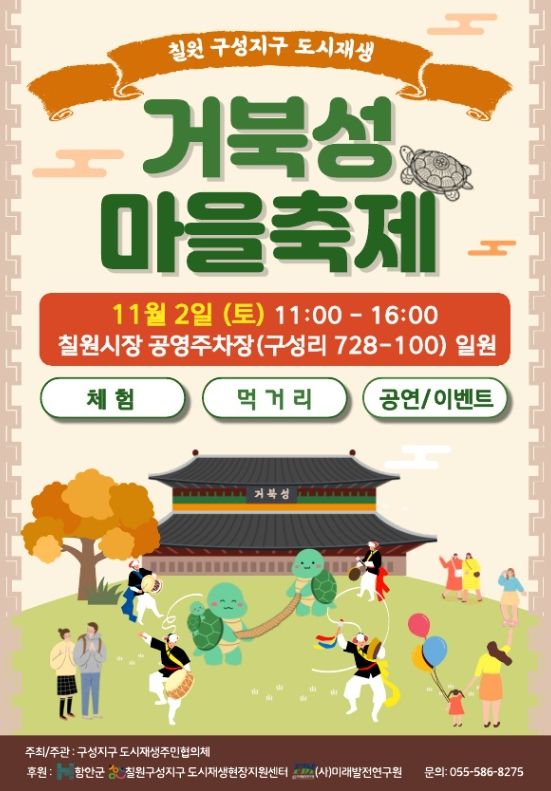 [경남도민뉴스=이상민 기자] 함안군은 ‘칠원 구성지구 도시재생 거북성 마을축제’가 오는 2일 토요일 오전 11시부터 오후 4시까지 칠원읍 구성리 칠원시장 공영주차장 일원(구성리 728-100)에서 개최된다고 밝혔다.
