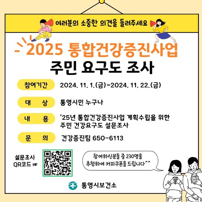 [경남도민뉴스=김부경 기자] 통영시는 오는 11월 1일부터 22일까지 2025년 지역사회 통합건강증진사업의 효율적 추진과 시민건강증진을 목표로 하는 계획수립을 위해 주민요구도 조사를 실시한다.