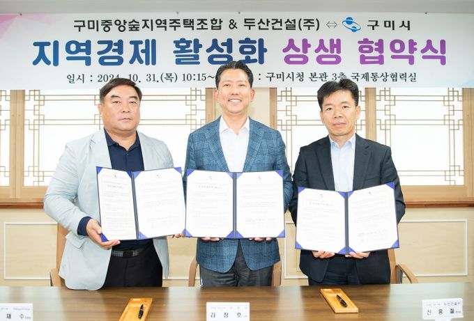[경남도민뉴스=이돈휘 기자] 구미시는 31일 시청 국제통상협력실에서 구미중앙숲지역주택조합과 두산건설㈜와 함께 지역 건설산업과 경제 활성화를 위한 상생협약(MOU)을 체결했다. 이번 협약을 통해 구미시는 지역 건설 업체의 참여를 확대하고 지역 경제의 활력을 높이는 다양한 방안을 마련했다.