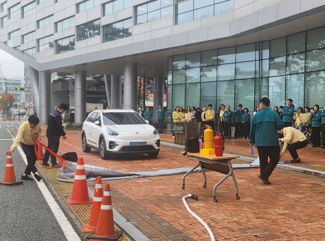 이번 자체 소방 훈련은 직원들의 화재 대응 역량을 강화하기 위해 마련됐으며, 훈련 주요 내용은 ▲화재 발생 시 대피요령 ▲중요문서 반출 ▲응급환자 후송 ▲화재 진화를 위한 소화기 및 소화전 사용법 ▲전기차 화재 대응 요령 등이다.
