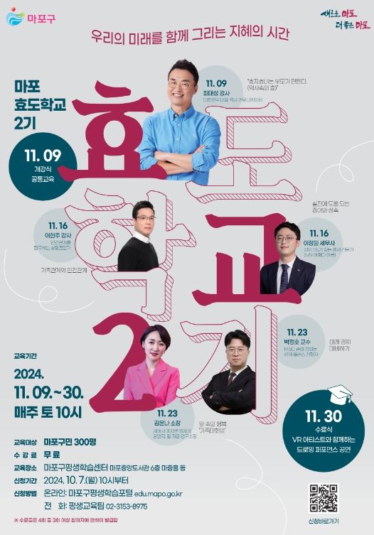 2024년 6월 22일부터 7월 13일까지 진행된 ‘마포 효도학교’ 1기가 큰 호응을 얻어 이번 2기도 다양한 분야에서 활약하고 있는 강사진으로 구성했다.
