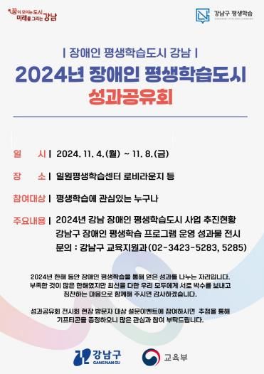 [경남도민뉴스=김완호 기자] 꿈이 모이는 도시, 미래를 그리는 강남구가 11월 4일부터 8일까지 일원평생학습센터 로비에서 ‘장애인 평생학습도시 성과공유회’를 개최한다.