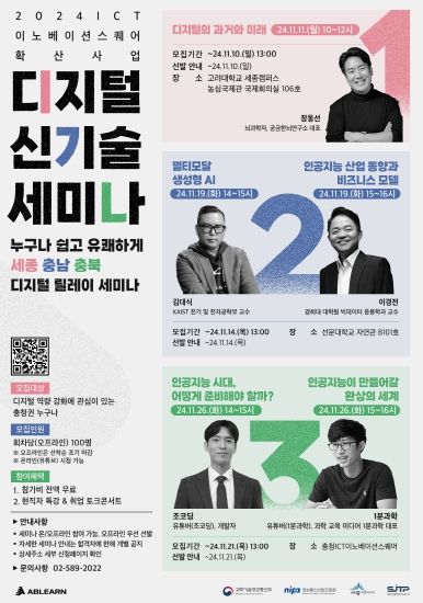 이번 세미나는 세종-충남-충북 순으로 충청권 릴레이로 진행되며, 디지털 역량 강화에 관심 있는 충청권 거주자 누구나 ▲AI 분야의 전문가 특강과 ▲IT 유튜버와의 취업 토크콘서트에 참여할 수 있다.