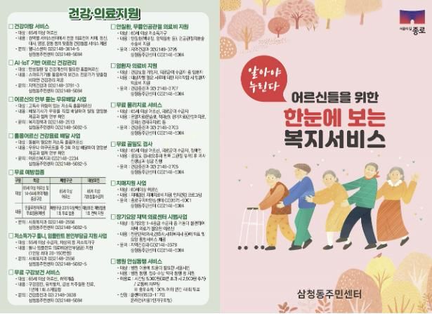 [경남도민뉴스=김완호 기자] 종로구 삼청동이 정보 접근에 취약한 어르신들을 위해 ‘한눈에 보는 복지서비스’ 안내지를 제작해 호응을 얻고 있다.