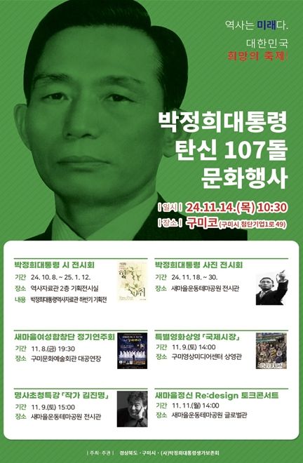 기념식에 앞서 11월 9일에는 영화 ‘국제시장’이 영상미디어센터에서 상영되고, 소설 ‘무궁화꽃이 피었습니다’의 저자 김진명 작가 초청 강연이 새마을운동테마공원에서 열린다. 개관 3년 차를 맞이한 박정희대통령 역사자료관에서는 특별 전시 '시(詩), 당신을 떠올리게 하는 향취'를 내년 1월 12일까지 선보인다. 전시는 박정희 대통령의 애국정신과 육영수 여사에 대한 애정을 담은 시, 전시 영상 등을 통해 대통령의 인간적인 면모를 시민들에게 전달하며 큰 호응을 얻고 있다.