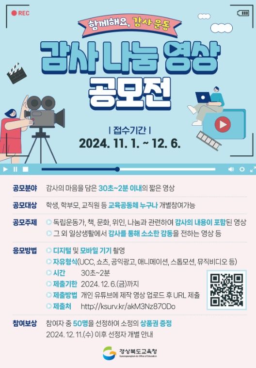 경북교육청은 12월 11일 이후 50편의 우수 영상을 선정해 소정의 상품권을 증정할 계획이다.