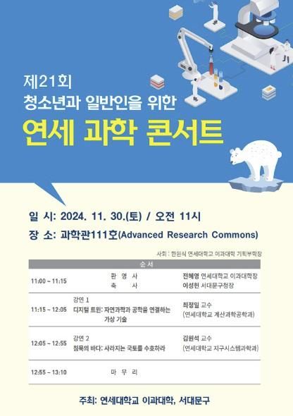 [경남도민뉴스=김완호 기자] 서대문구가 연세대학교 이과대학(학장 전혜영)과 공동으로 이달 30일 오전 11시부터 오후 1시 10분까지 연세대 과학관 111호에서 ‘제21회 연세 과학 콘서트’를 개최한다.