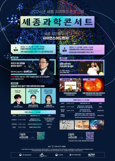 세종과학콘서트는 양일간 14시부터 진행되며, 첫날인 22일(금) ‘알쓸신잡’ 김상욱 교수(경희대학교)의 ‘우리가 왜 과학을 알아야할까?’를 주제로, 세종시대의 과학기술부터 양자물리까지 흥미로운 과학 이야기가 펼쳐질 예정이다.