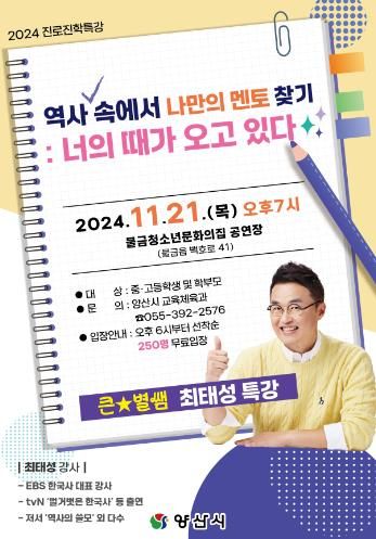 [경남도민뉴스=최미정 기자] 양산시는 학생들의 꿈과 진로 방향 설계에 도움을 주기 위한 진로진학 특강을 11월 21일 오후 7시 물금청소년의집 공연장에서 개최한다.