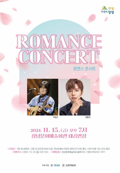 [경남도민뉴스=김병현 기자] 창녕군은 창녕문화예술회관에서 오는 15일 오후 7시 기획공연 ‘로맨스 콘서트’를 개최한다고 밝혔다.