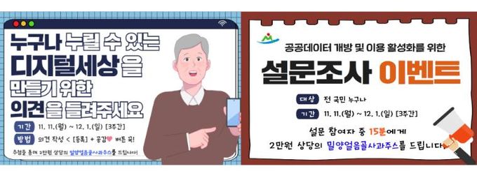 [경남도민뉴스=나희준 기자] 밀양시는 디지털 기술과 서비스를 시민 누구나 쉽고 편하게 누릴 수 있도록 다음 달 1일까지‘누구나 누릴 수 있는 디지털 포용 사회를 만들기 위한 의견 청취’및‘공공데이터 개방 및 이용 활성화를 위한 설문조사 이벤트’를 함께 실시한다고 밝혔다.