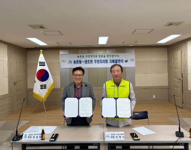 [경남도민뉴스=변정형 기자] 산청군 생초면 주민자치회는 대전 대덕구 송촌동 주민자치회와 자매결연 협약을 체결했다고 13일 밝혔다.